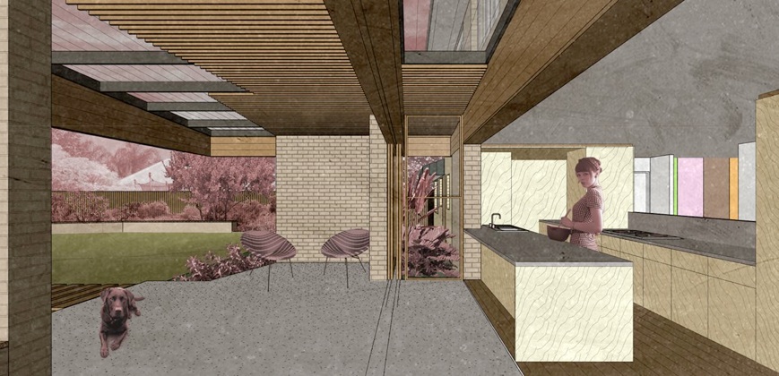 An existing 22 year old house at Redcliffe suffered from disconnection with its site and between its internal spaces. Improving the internal connections meant removing the interiors only expressive element - a face-brick wall with an archway opening. New double brick walls followed as the defining material of the new work, allowing a continuity between inside and outside. The line of enclosure separating the house and backyard has been pushed out into the clear-roofed patio structure, bringing a new light-filled edge to the interior. The material authenticity is continued through overhead timber elements, and stone caps to low walls that create occupiable edges to landscape spaces and the street interface.